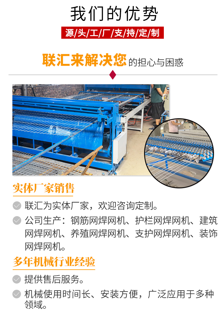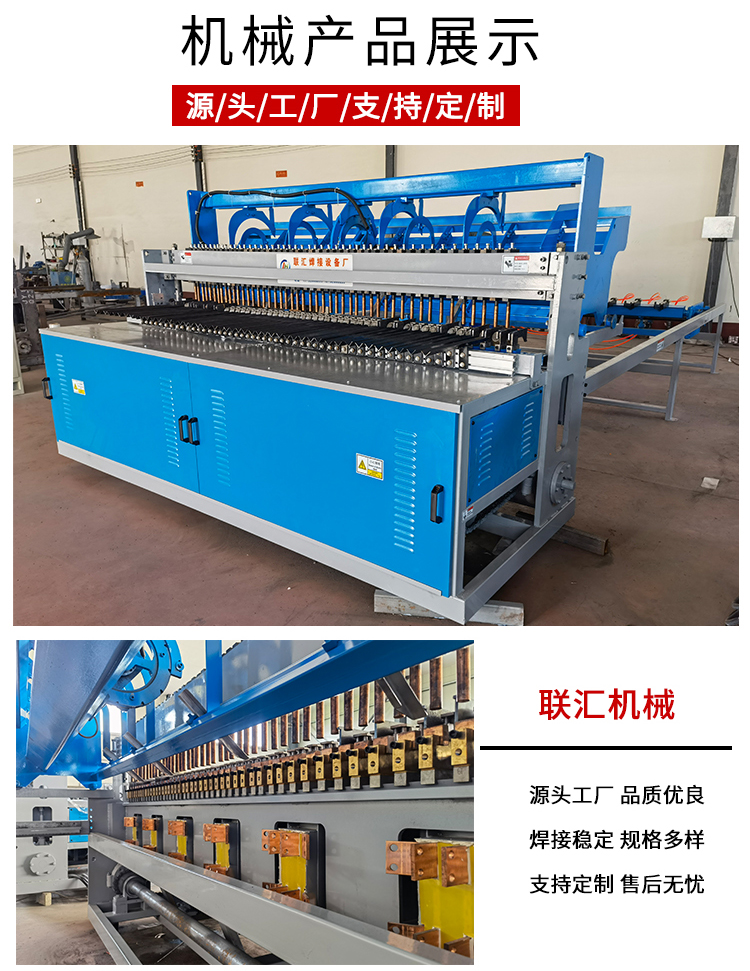 护栏网焊网机:机场、高速、车间隔离等护栏网片生产 主要包括:放线盘储丝,调直器,焊接主机,转盘漏斗部分,数控拉网部分,自动剪网机,自动落片,输出小车等功能。主要生产...