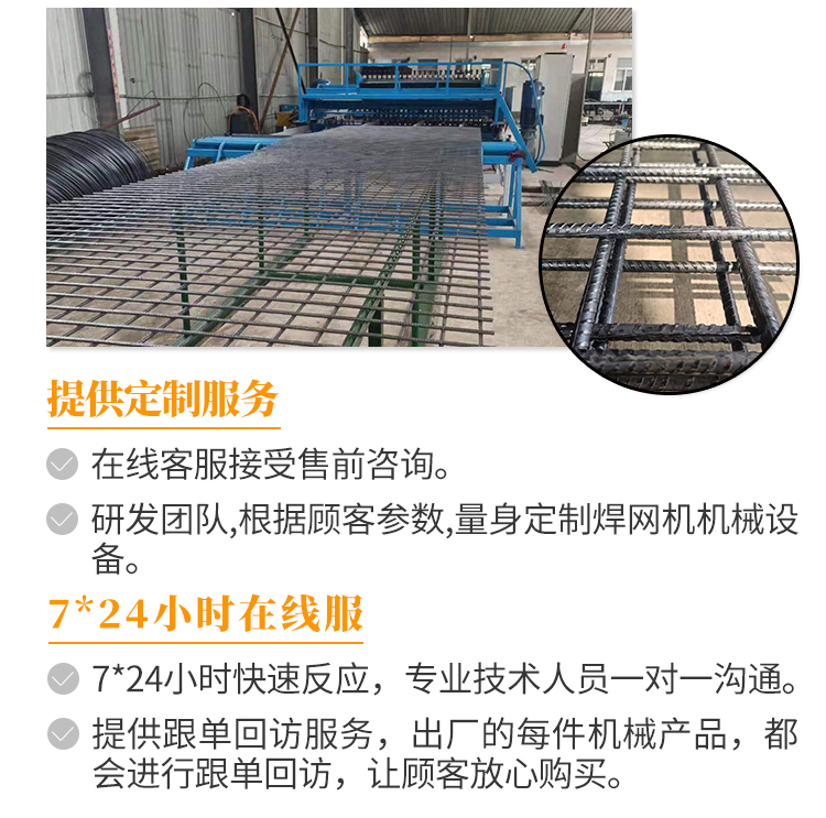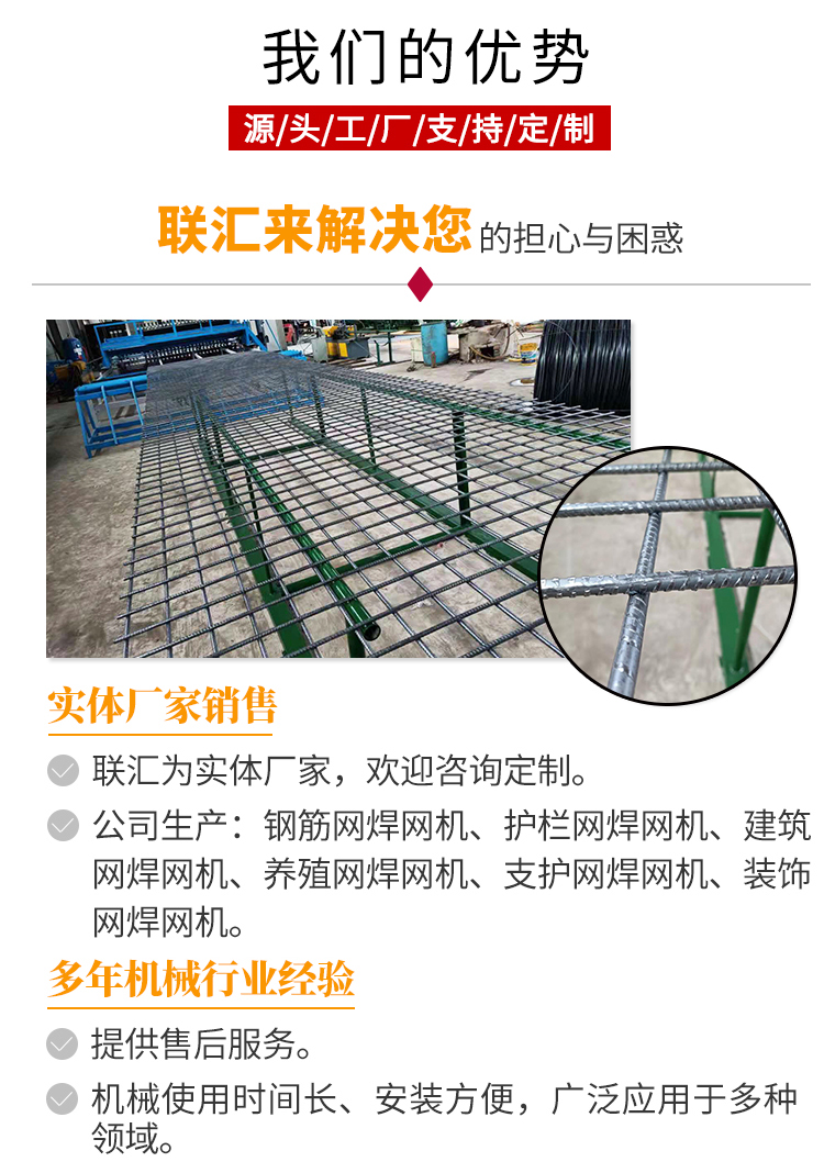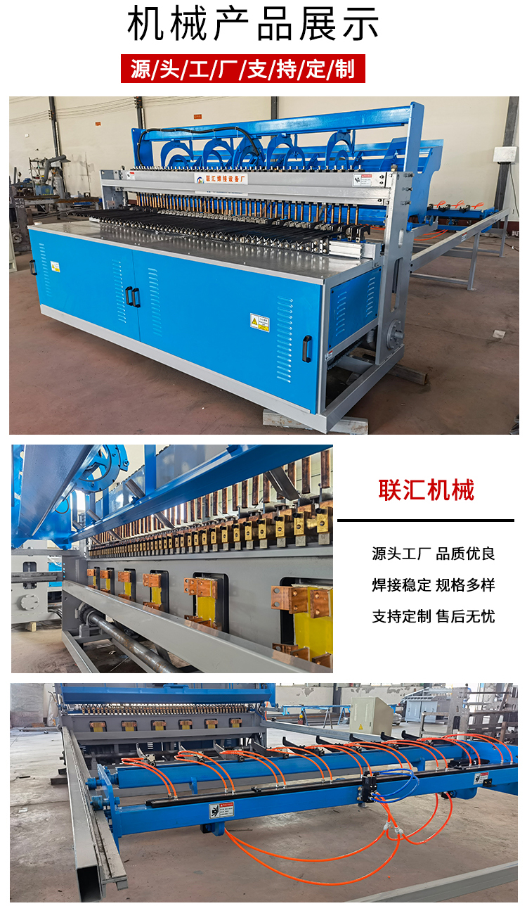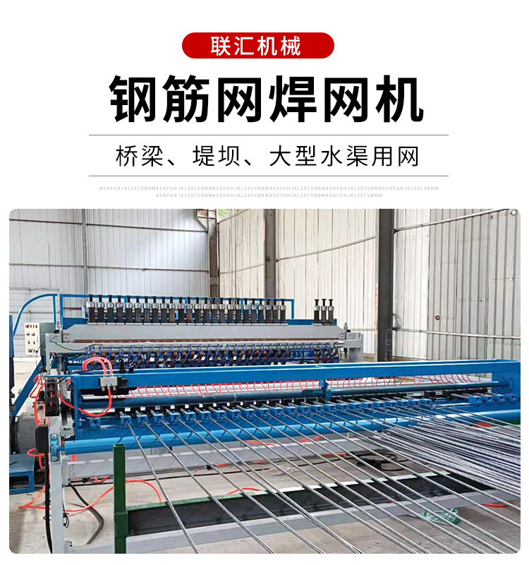 钢筋网焊网机:桥梁、堤坝、大型水渠用网 主要生产用于桥梁,水利,高速公路,国家重点工程等浇筑混凝土用的钢筋网片,焊网宽度最大可达2.5米,长度最大可达12米,焊接直径6mm...